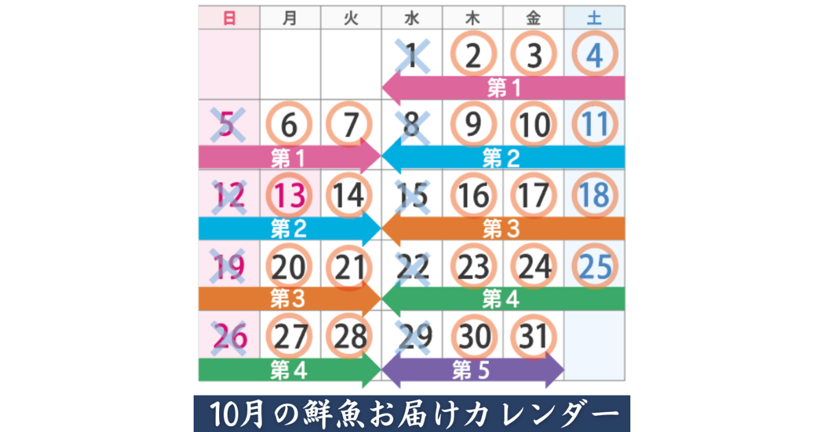 【10月の鮮魚お届け日カレンダー】 弁慶丸新聞に毎月掲載している、定期注文の方の「鮮魚お届け日カレンダー」を掲載します。 月によっては兼用となる週もございますので、お間違いのないようご確認よろしくお願いいたします。 例) 第二週の木曜日お届け希望→今月は10/9(木)お届け予定 第四週の火曜日お届け希望→今月は10/28(火)お届け予定 第一週と第三週の週末お届け希望→今月は10/4(土)と 10/18(土)にお届け予定