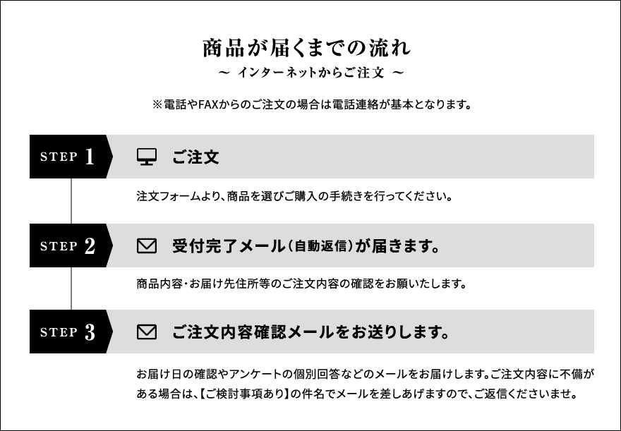 個別注文受付メールが深夜になる場合もございますので、ご了承ください。