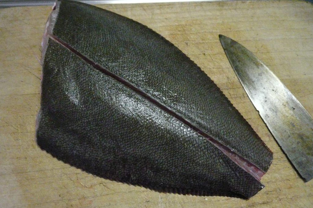⑭腹鰭と背ビレの、際皮をぐるりと切る。