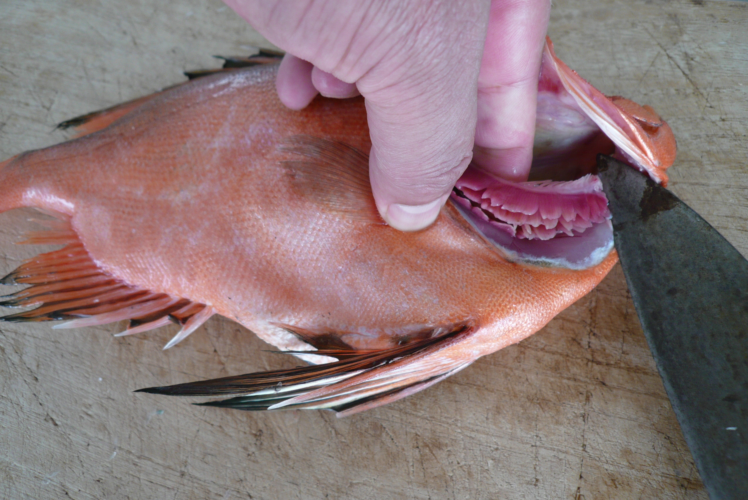 ⑧見慣れない姿の魚は、刺し身に顔を見せてもおもしろい。盛りつける姿が左向きになるように、片側を下ろす。胸ビレの際から、背骨に当たるまで包丁を入れる。