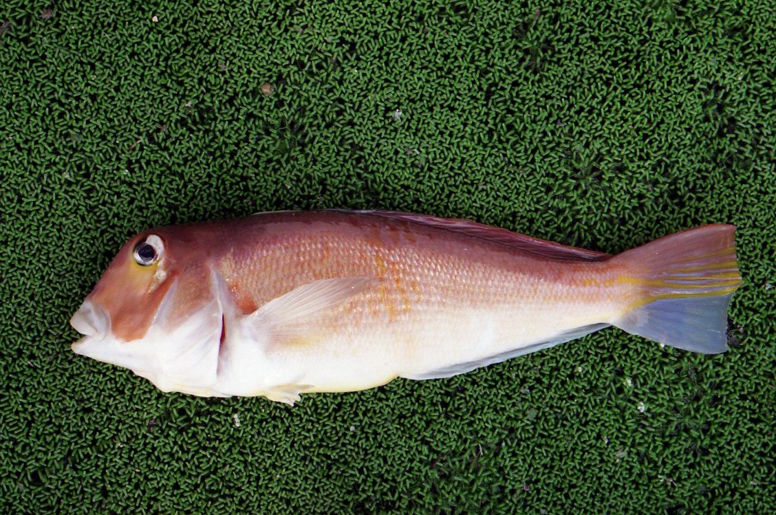①捕れたてのアマダイは、全身がヌラリと光っている。