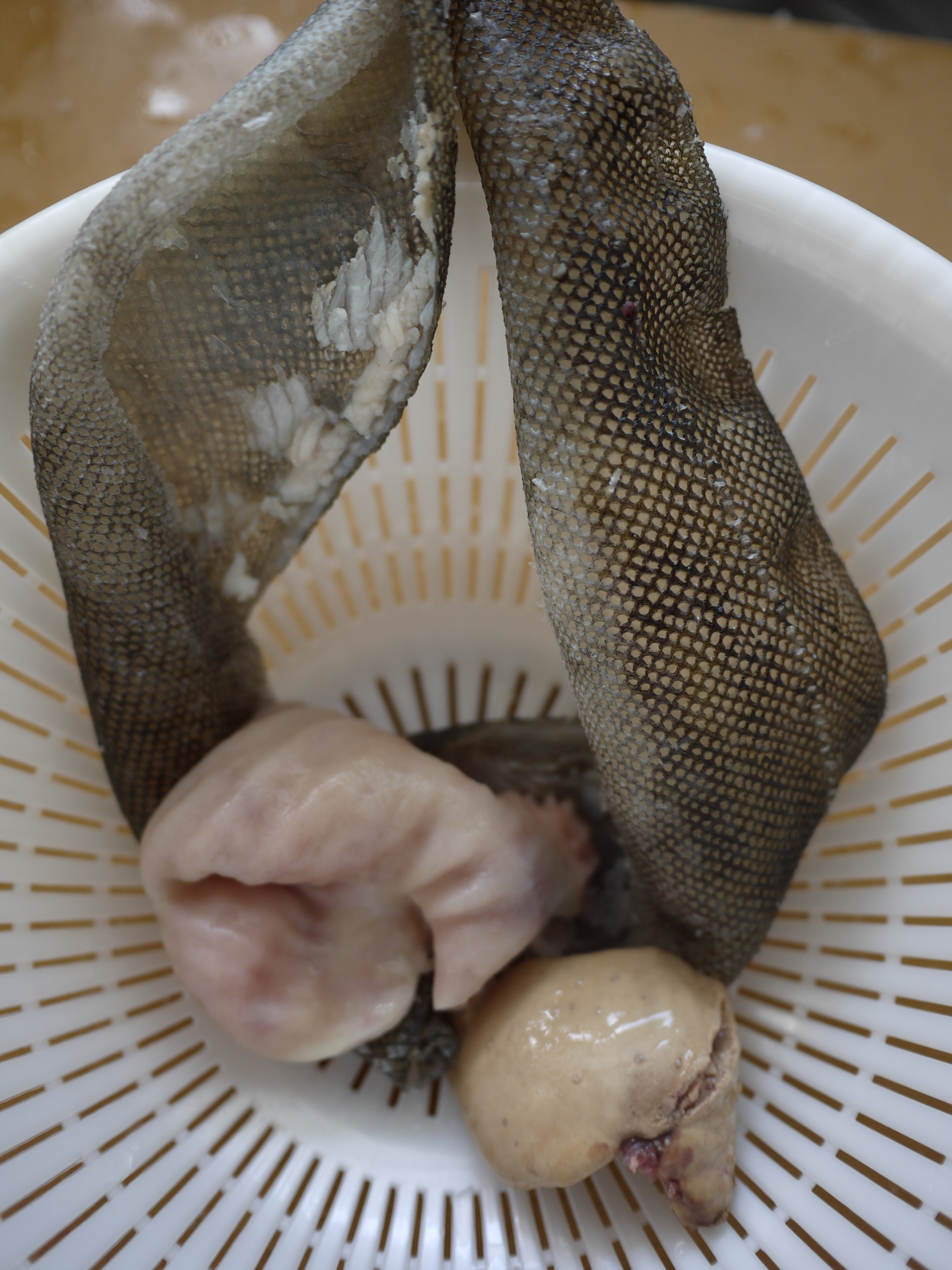 ㉙ 皮を湯引きして冷水に取ると、胃袋と肝臓の珍味三種が揃う。