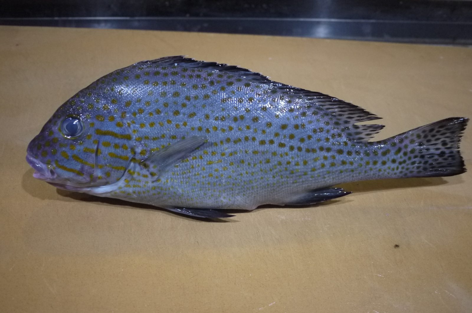 ②コロダイの成魚には、縞模様がない。よく目立つ細かい班点が特徴だ。