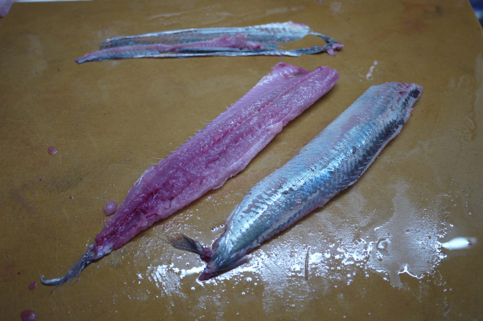 ②胸ビレの際から頭部を落としたら、腹身を5㍉ほどの幅で、肛門下まで切り落とす。水洗いして水気を拭き取り、下ごしらえの完了だ。