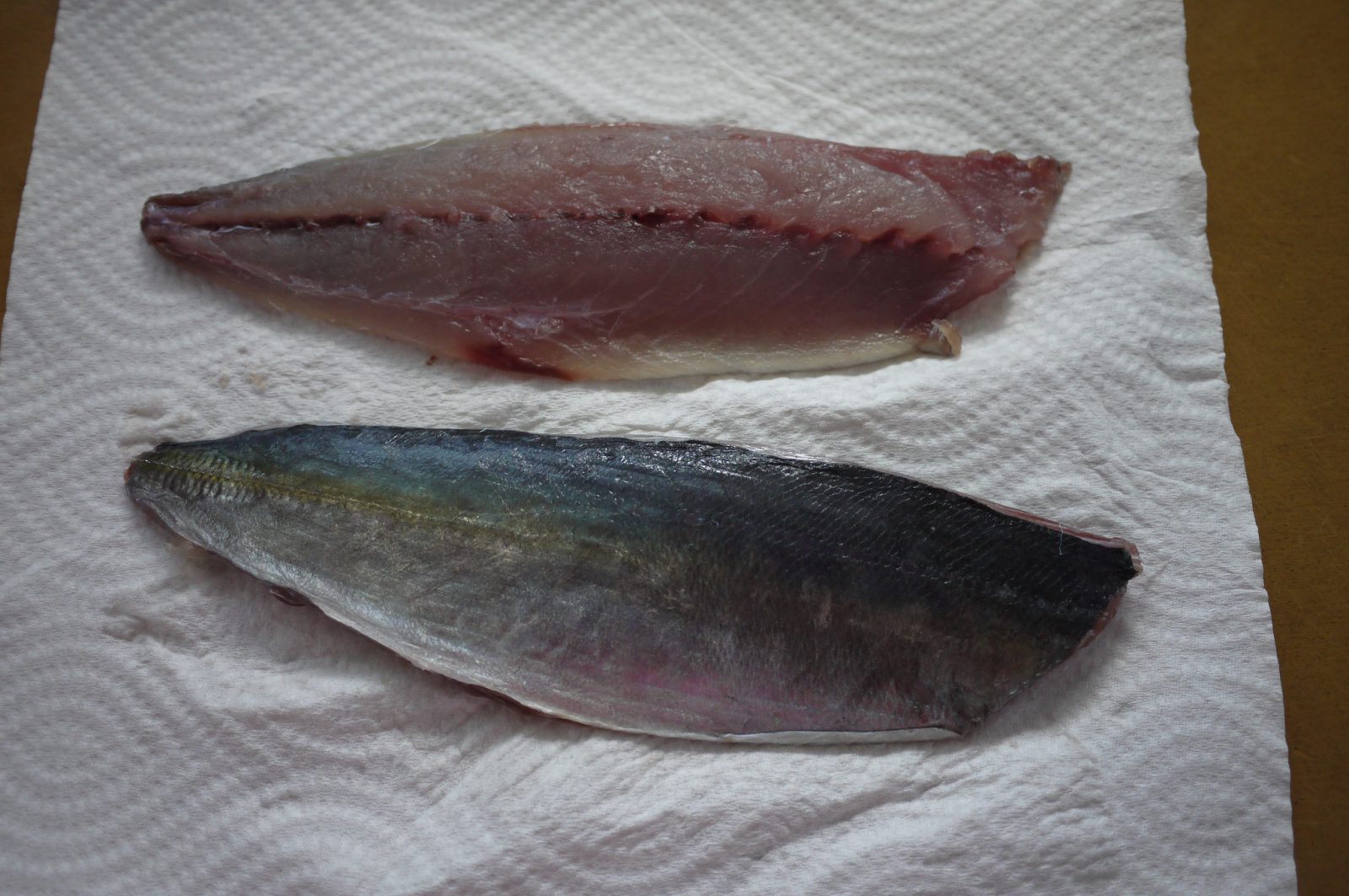㉜下ろし方は、クサヤモロと同じ。㉒までの処理をしたら、今回は塩を使わない。器に昆布を敷いただけで、生酢に6~12時間漬け込むだけだ。