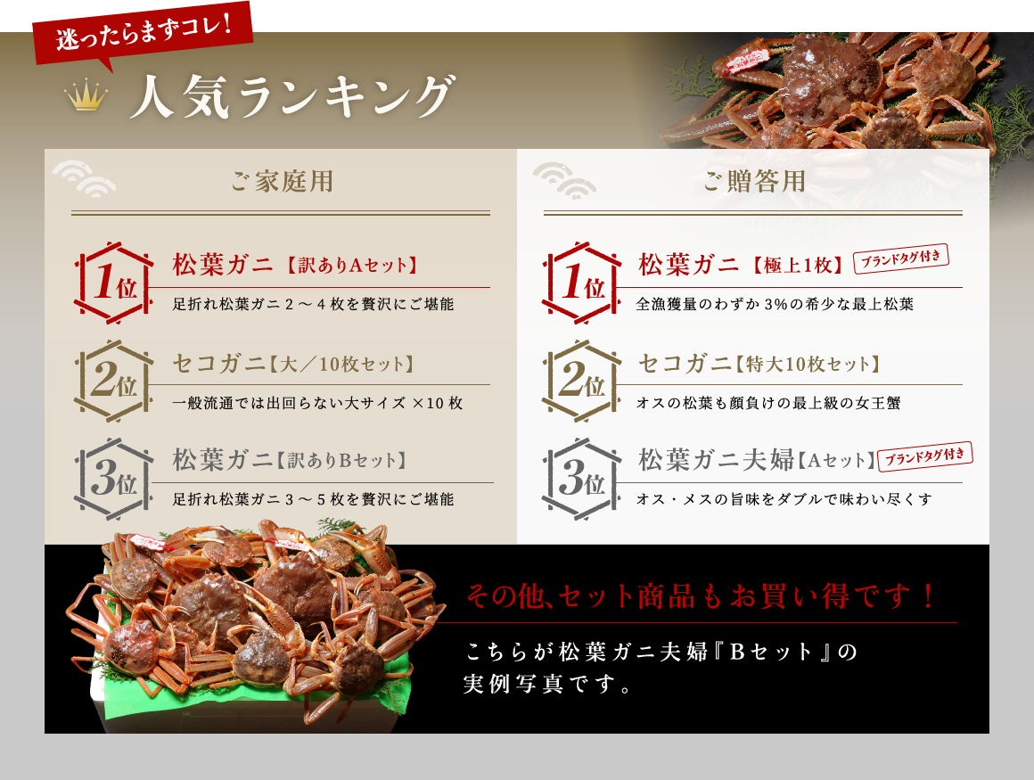 用途によって人それぞれだと思いますが、やはり先行予約が一番、価格帯が安いので、11月のお届け分を確保して、「初物」を頂きたいというご要望が多いかと思います。12月に入りますと、「お歳暮」の需要が高まり、ブランドタグ付きの松葉ガニや松葉ガニとセコガニの両方が入った「松葉ガニ夫婦セット」がよくご注文をいております。カニ需要が最高潮に高まるクリスマスパーティーや年末、年越しの主役として、ご家庭用の「訳あり松葉ガニ」A・Bセットや年末で漁期が終了してしまう「セコガニ特大サイズ」が年末にかけてよく売れているかと思います。サイト上にも掲載している「売れ筋ランキング」を再度、掲載しておきますので、ご参考にして下さい。