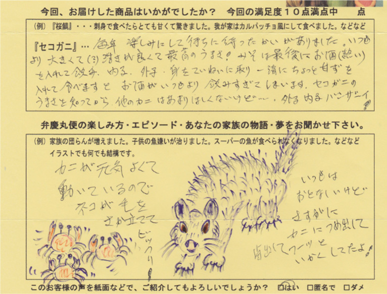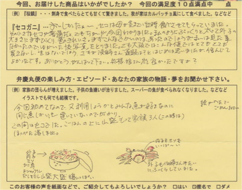 弁慶丸 河西 信明 様 お送りいただいたセコガニはこの土日家族三人で完食いたしました。猛烈に美味しかったです。この3年間で一番美味しいように感じられました。